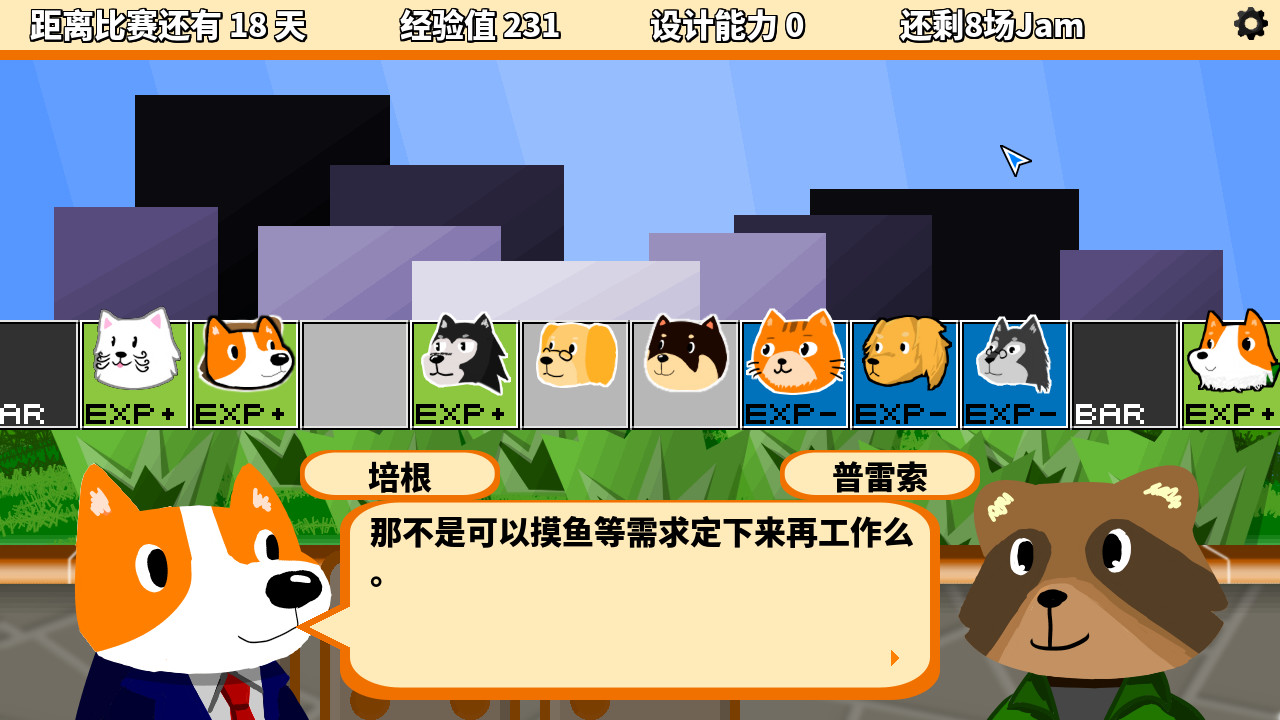 Dog Jam是一款模拟Game Jam48小时游戏开发的卡牌游戏,扮演柯基培根,在业余时间参加Game Jam 48小时极限游戏开发大赛。 玩家需要构筑自己的套牌,面对各个Game Jam各具特色的主题,提出并完成一个个构思以取得更好的成绩,通过取得好成绩来获得更多的经验以获得更多的卡牌。通过在前七场Game Jam中取得优异成绩以获得年度大赛Dog Jam邀请赛的资格。 在游戏中,主题之外的构思都是由玩家自己打出的,每个构思具有各不相同的特色,完成尽可能多的构思能让你的作品更加优秀,但是未能及时完成的构思则会成为影响最后的评分的漏洞。主题的特殊效应会影响比赛的思路,而主题是在你构筑好套牌之后才会公布,使得临场发挥更为重要。 在比赛之外,你需要安排日程,与能一起组队参加Game Jam,提供各种特殊效果的伙伴碰头,提升自己的能力,获取更多的卡牌。