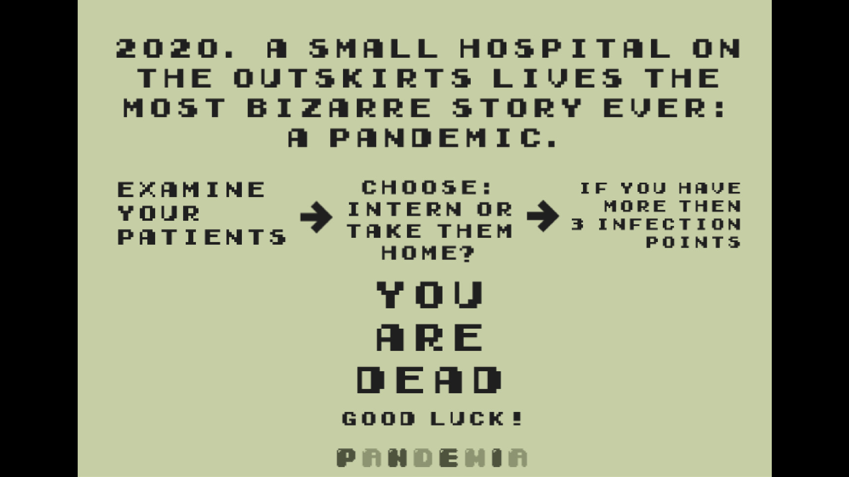 APP下载 大小:MB 下载:58次 Pandemia 独立游戏PVE即时制第三人称 支 持:PC 分 类:独立游戏 评 分: 开发者:Game e Arte 下载量:58次 发 布:2022-10-17 手机扫码免费下载 #Pandemia截图 #Pandemia简介 2020. 圣保罗郊区的一家小医院讲述了有史以来最离奇的故事:一场流行病。 许多人呼求服务。 富贵贫贱。 女人和男人。 黑和白。 儿童和老人。 医院人满为患。 作为一名医生,Keyla 需要进行检查。 检查并选择。 在选择患者的同时,Keyla 也需要有她个人的选择。 #Pandemia下载