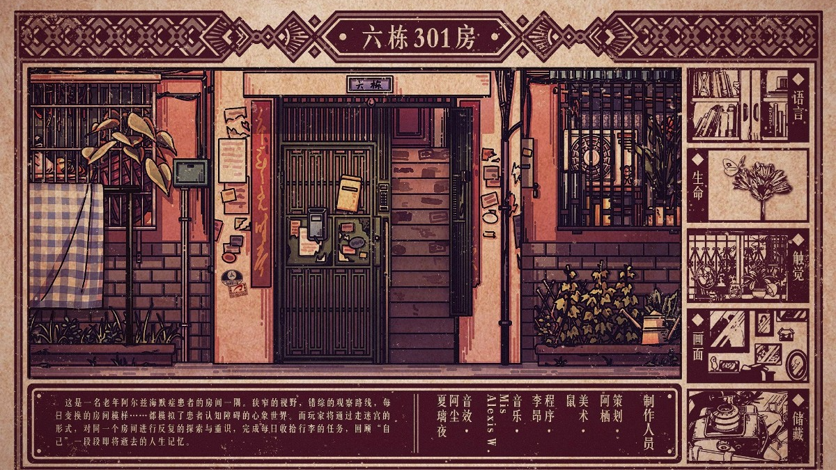 APP下载 大小:MB 下载:68次 6栋301房 PVE即时制第一人称 支 持:PC 分 类:益智游戏 评 分: 开发者:帧间工作室 下载量:68次 发 布:2022-10-17 手机扫码免费下载 #6栋301房截图 #6栋301房简介 《6栋301房》是一款解谜类益智游戏,这是一名老年阿尔兹海默症患者的房间一隅。狭窄的视野,错综的观察路线,每日变换的房间...都模拟了患者认知障碍的心象世界。而玩家将通过走迷宫的形式,对同一个房间进行反复的探索与重识,完成每日收拾行李的任务,回顾“自己”一段段即将逝去的人生记忆。 #6栋301房下载