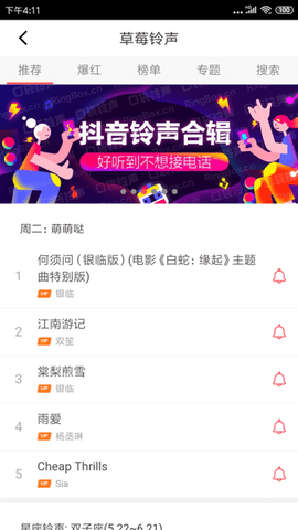 草莓铃声app是一款来电铃声应用程序、该软件推荐了众多超级流行的铃声、每日平台的铃声列表都会实时更新、拥有一组可以激发人们兴趣的音乐铃声、各种选择都很nice、用户自己可以自由选择今天的经典歌曲、彩色铃声也可以自己制作、草莓铃声app还能听音乐自动设别歌曲。这是一款为用户铃声专门打造的软件、快来下载试试吧。